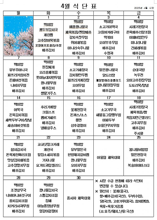 2025년 4월 식단표 ^^ 페이지 정보 작성자 관리자 작성일25-03-28 09:03 조회1,156회 댓글0건 이전글 다음글 목록 본문 4월에도 맛있게 먹고 힘 내서 열심히 일하겠습니다! ^^ 이전글 다음글 목록