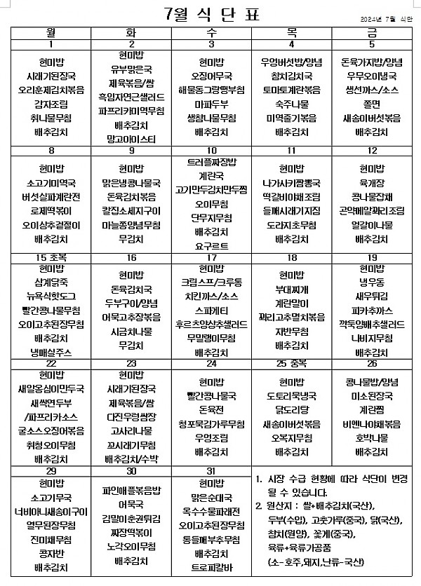 2024년 7월 식단표 ^^ 페이지 정보 작성자 관리자 작성일24-06-27 14:55 조회2,542회 댓글0건 이전글 다음글 목록 본문 무더운 여름이지만 맛있게 먹고 힘 내서 7월에도 열심히 일하겠습니다! ^^ 이전글 다음글 목록