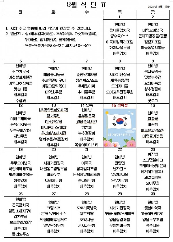 2024년 8월 식단표 ^^ 페이지 정보 작성자 관리자 작성일24-07-29 15:07 조회2,462회 댓글0건 이전글 다음글 목록 본문 더워도 너무 무더운 날씨로 많이 힘들지만 맛있게 먹고 힘 내서 8월도 열심히 달리겠습니다! ^^ 이전글 다음글 목록
