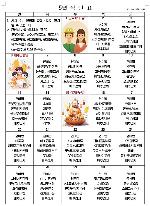 2024년 5월 식단표 ^^ 페이지 정보 작성자 관리자 작성일24-04-30 09:03 조회3,106회 댓글0건 이전글 다음글 목록 본문 5월에도 건강한 음식을 맛있게 먹고 힘내서 열심히 일하겠습니다! ^^ 이전글 다음글 목록