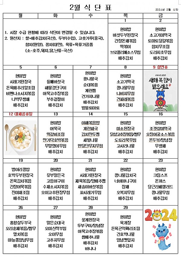 2024년 2월 식단표 ^^ 페이지 정보 작성자 관리자 작성일24-01-29 18:56 조회3,401회 댓글0건 이전글 다음글 목록 본문 맛있게 먹고 열심히 일하며 추운 겨울을 잘 이겨내겠습니다. ^^ 이전글 다음글 목록