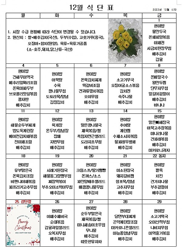 12월 식단표입니다.