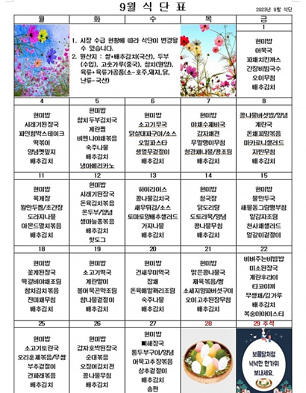 2023년 9월 식단표 ^^