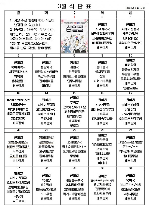 2023년 3월 식단표 ^^ 페이지 정보 작성자 관리자 작성일23-02-28 15:14 조회3,814회 댓글0건 이전글 다음글 목록 본문 3월에도 맛있게 먹고 열심히 달려보아요! ^^ 이전글 다음글 목록