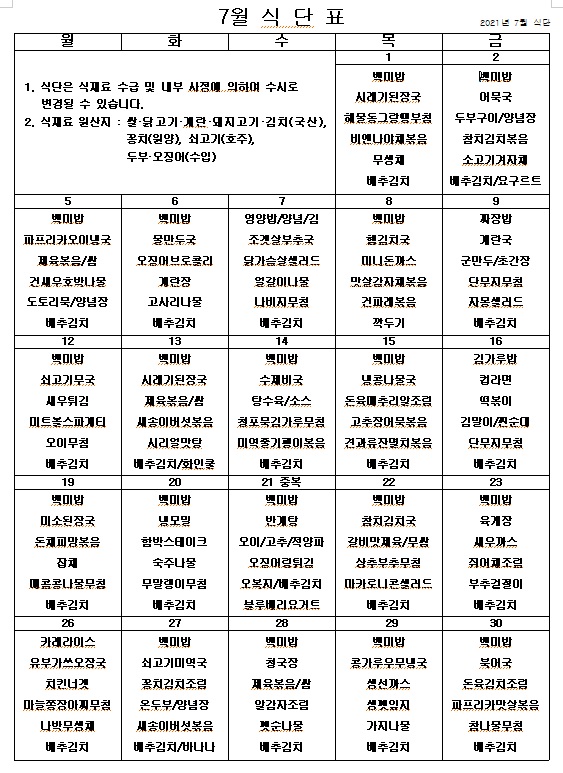 2021년 7월 식단표 페이지 정보 작성자 관리자 작성일21-06-30 15:25 조회4,210회 댓글0건 이전글 다음글 목록 본문 더워지는 여름 맛있게 먹고 모두 힘냅시다! ^^ 이전글 다음글 목록