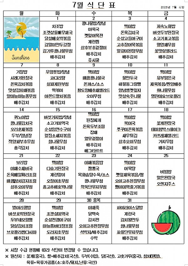 2025년 7월 식단표 ^^ 페이지 정보 작성자 관리자 작성일25-06-30 18:12 조회1,037회 댓글0건 이전글 다음글 목록 본문 무더운 여름에도 맛있게 먹고 힘 내서 열심히 일해보겠습니다! ^^ 이전글 다음글 목록