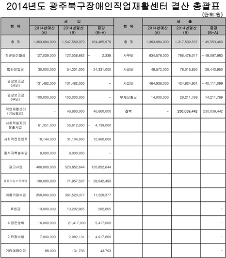 2014년도 광주북구장애인직업재활센터 결산 공고 페이지 정보 작성자 배지연 작성일15-03-13 17:39 조회13,960회 댓글0건 이전글 다음글 목록 본문 2014년도 광주북구장애인직업재활센터 결산에 관하여 다음과 같이 공고 합니다. 이전글 다음글 목록