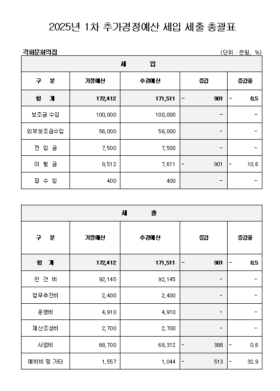 2. 공고사항 : 2025년 각화문화의집 1차 추가경정 세입·세출 예산서