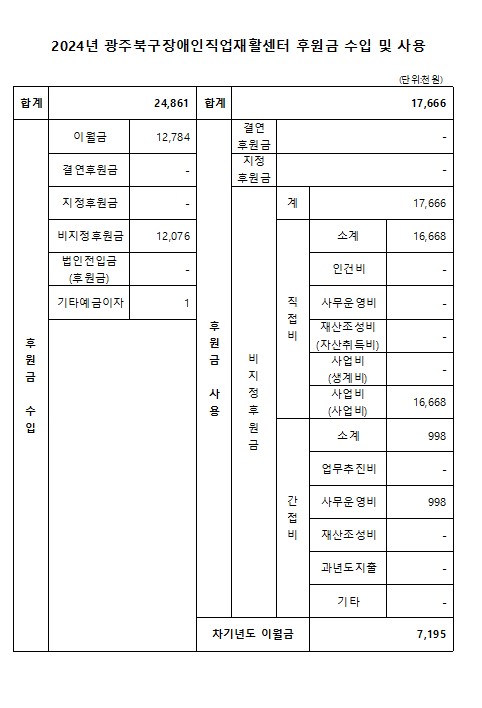 2024년 광주북구장애인직업재활센터 후원금 수입 및 사용내역 공고 페이지 정보 작성자 관리자 작성일25-03-11 16:06 조회7,800회 댓글0건 이전글 다음글 목록 본문 사회복지법인 및 사회복지시설 재무․회계규칙 제41조의 6의 규정에 의거하여 2024년 광주북구장애인직업재활센터 후원금 수입 및 사용 내역을 다음과 같이 공개합니다. 이전글 다음글 목록