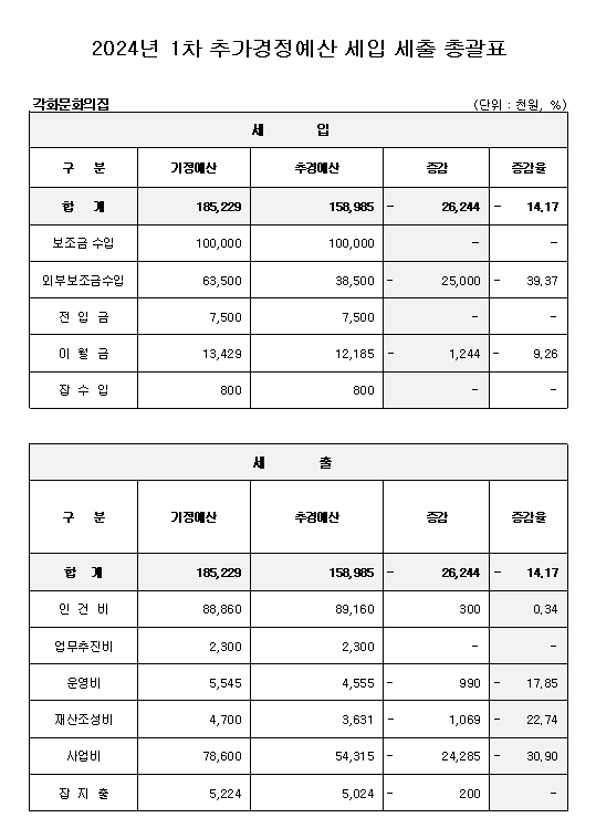 2024 각화문화의집 1차 추가경정 세입·세출 예산안 공고