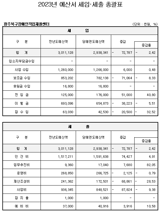 2023 광주북구장애인직업재활센터 세입세출 예산서 공고