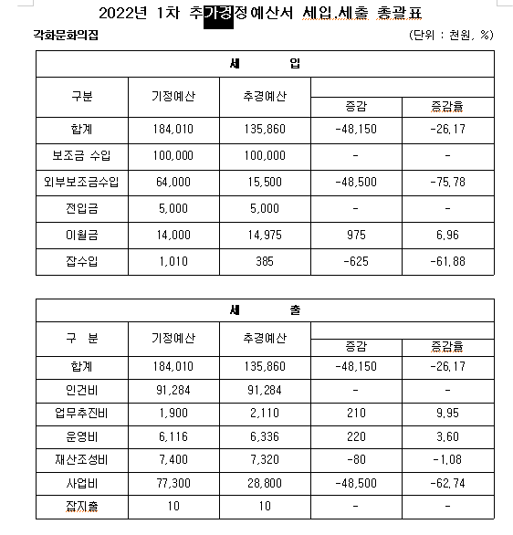 2. 공고사항 : 2022 각화문화의집 1차 추가경정 세입·세출 예산서
