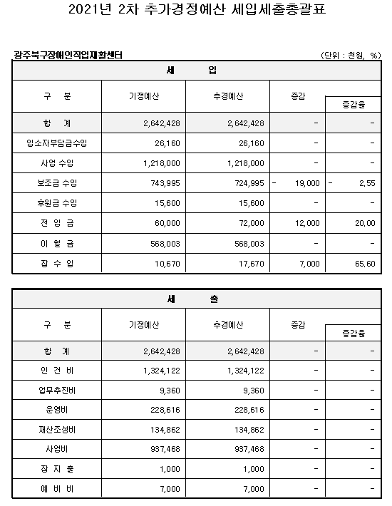2. 공고사항 : 2021 광주북구장애인직업재활센터 2차 추가경정 세입·세출 예산서