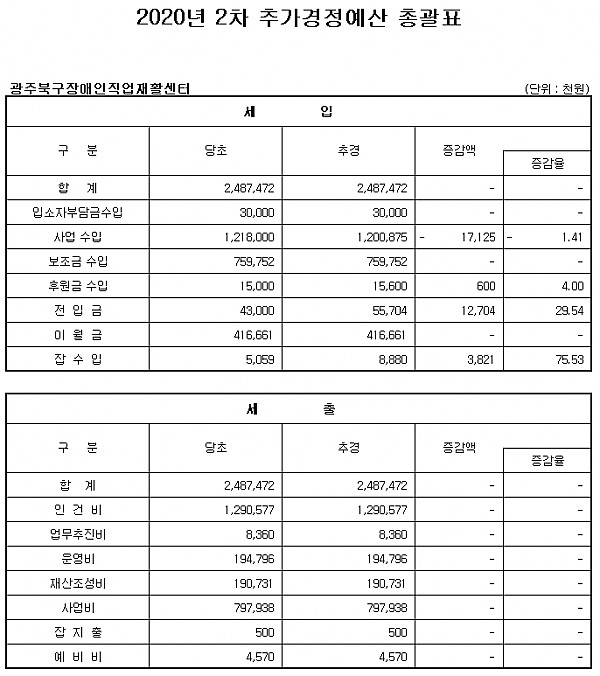 2020 광주북구장애인직업재활센터 2차 추가경정 세입세출(예산) 공고