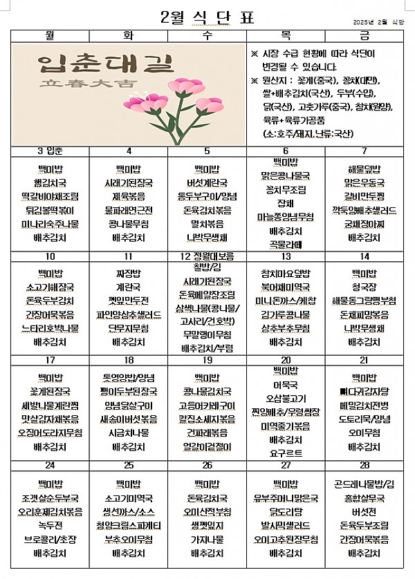 2025년 2월 식단표 ^^