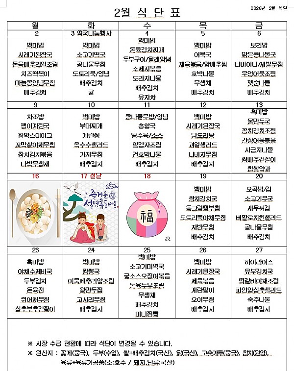 2026년 2월 식단표 ^^ 페이지 정보 작성자 관리자 작성일26-01-29 14:46 조회548회 댓글0건 이전글 다음글 목록 본문 2월에는 입춘도 있고, 설 명절도 있습니다. 2월에도 건강한 음식을 맛있게 먹고 열심히 일하겠습니다. 이전글 다음글 목록