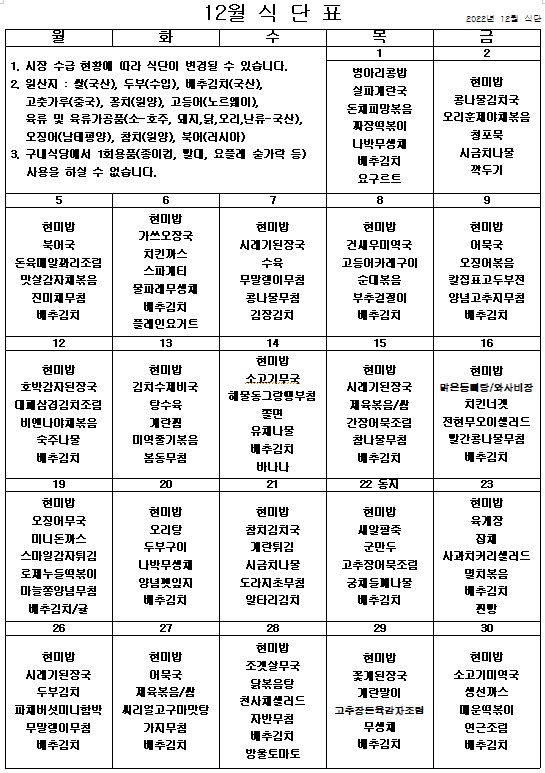 2022년 12월 식단표 ^^