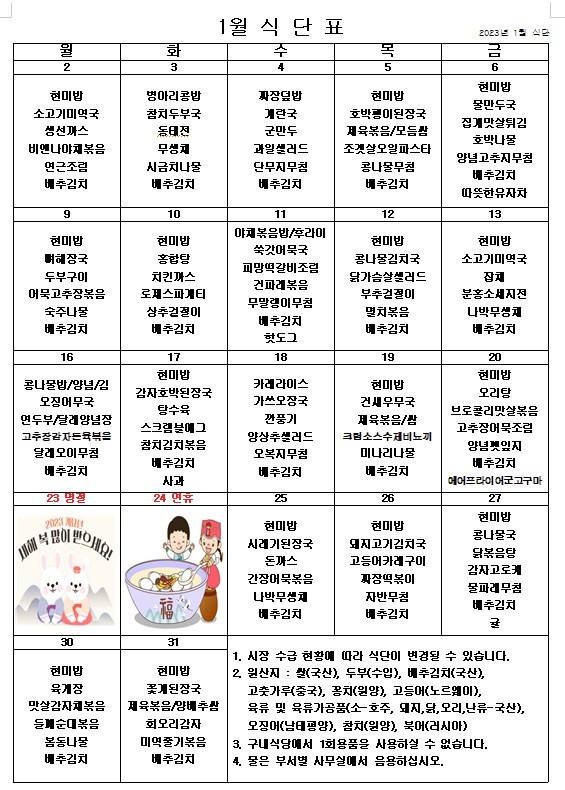 2023년 1월 식단표 ^^ 페이지 정보 작성자 관리자 작성일22-12-30 11:06 조회4,278회 댓글0건 이전글 다음글 목록 본문 내년에도 힘차게 달려봅시다! 이전글 다음글 목록
