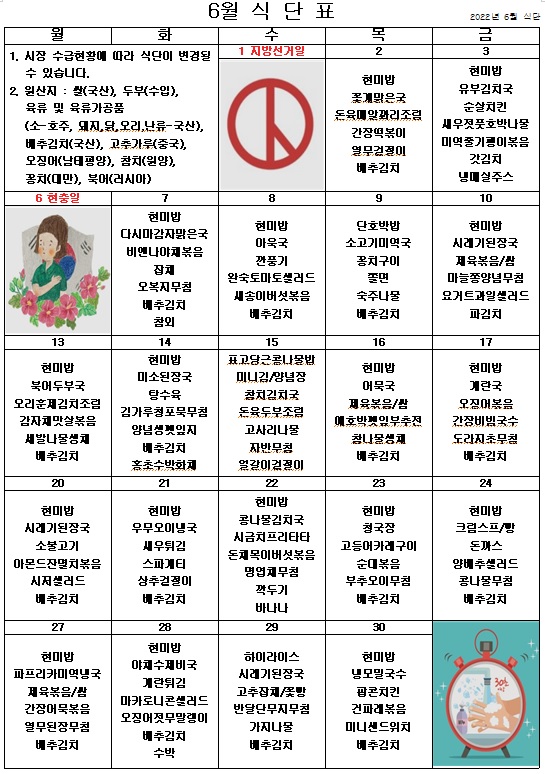 2022년 6월 식단표 ^^ 페이지 정보 작성자 관리자 작성일22-05-31 15:04 조회4,519회 댓글0건 이전글 다음글 목록 본문 더욱 알차고 맛있는 식단을 제공하도록 노력하겠습니다. ^^ 이전글 다음글 목록