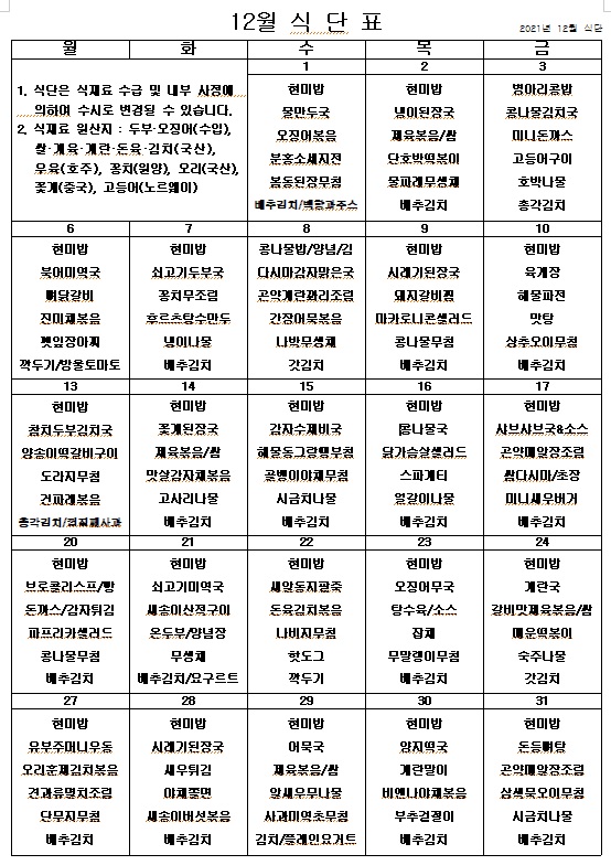 2021년 12월 식단표 ^^ 페이지 정보 작성자 관리자 작성일21-11-30 09:10 조회4,749회 댓글0건 이전글 다음글 목록 본문 어느덧 연말이 코 앞이네요. 맛있게 먹고 건강하게 지내면서 위드 코로나 시대를 현명하게 잘 이겨내봐요! ^^ 이전글 다음글 목록