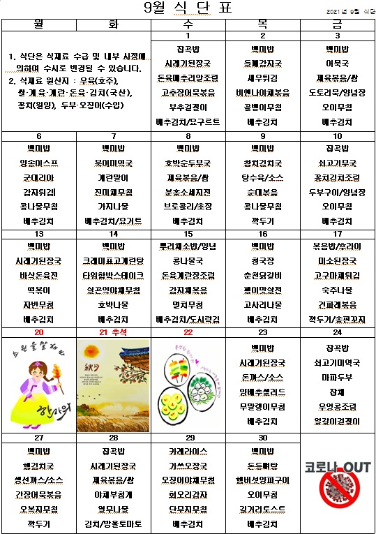 2021년 9월 식단표 ^^ 페이지 정보 작성자 관리자 작성일21-09-01 17:25 조회4,886회 댓글0건 이전글 다음글 목록 본문 맛있게 먹고 힘내서 화이팅! ^^ 이전글 다음글 목록