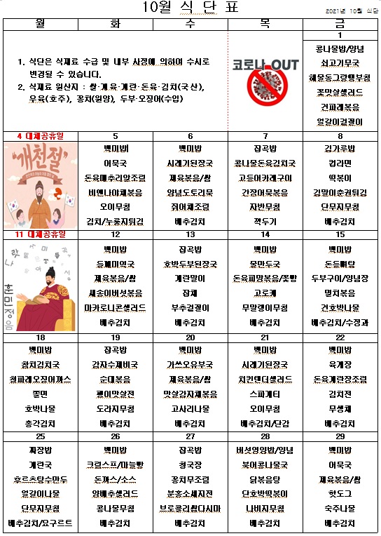 2021년 10월 식단표 ^^ 페이지 정보 작성자 관리자 작성일21-09-30 15:13 조회4,725회 댓글0건 이전글 다음글 목록 본문 어느덧 10월이 되었습니다. 코로나 확진자가 증가하는 추세이지만 센터에서 열심히 지내고, 안전하게 식사하면서 건강을 지키고 있습니다. ^^ 이전글 다음글 목록