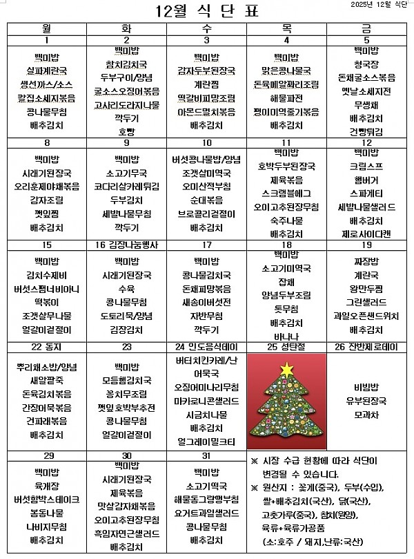2025년 12월 식단표 ^^ 페이지 정보 작성자 관리자 작성일25-11-27 21:11 조회982회 댓글0건 이전글 다음글 목록 본문 12월에도 맛있게 먹고 건강한 마음으로 열심히 일해보겠습니다. ^^ 이전글 다음글 목록