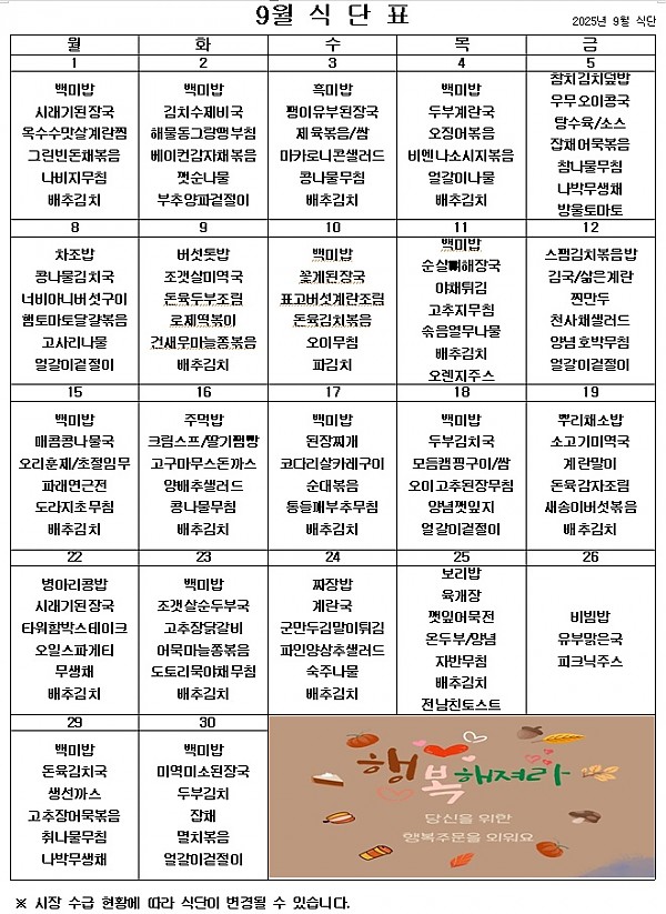 2025년 9월 식단표 ^^ 페이지 정보 작성자 관리자 작성일25-08-28 18:17 조회1,358회 댓글0건 이전글 다음글 목록 본문 처서가 지났지만 아직 무더위가 기승을 부리고 있습니다. 9월에도 맛있게 먹고 힘내서 즐겁게 일하겠습니다. 이전글 다음글 목록