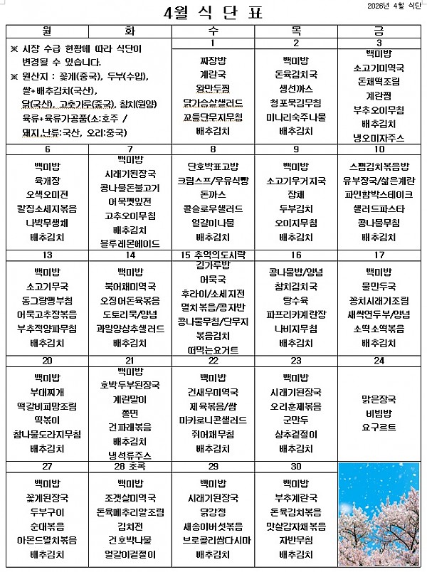2026년 4월 식단표 ^^ 페이지 정보 작성자 관리자 작성일26-03-31 16:13 조회141회 댓글0건 이전글 다음글 목록 본문 꽃이 완연하게 피는 따뜻한 4월입니다. ^^ 좋은 재료로 만든 맛있는 음식을 잘 먹고 건강하게 생활하겠습니다. 이전글 다음글 목록