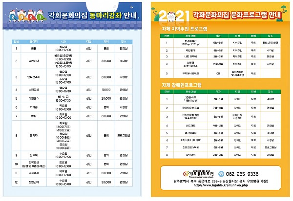 21년 동아리활동 안내 및 프로그램 안내 페이지 정보 작성자 정관용 작성일21-01-04 15:34 조회8,773회 댓글0건 이전글 다음글 목록 본문 21년도 동아리활동 안내 및 프로그램 안내 누구나 참여가능하고 배우고 싶은 분들은 사전에 연락바랍니다. (265-9336 각화문화의집) 이전글 다음글 목록