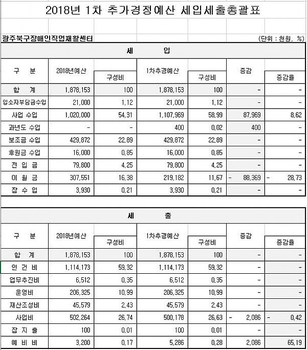 2018 광주북구장애인직업재활센터 1차 추가경정 세입세출(예산) 공고