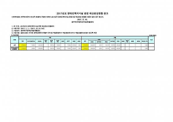 2017년 광주북구장애인직업재활센터 세입세출(예산) 공고 페이지 정보 작성자 배지연 작성일17-05-10 19:00 조회15,892회 댓글0건 이전글 다음글 목록 본문 사회복지법인 재무회계규칙 제10조 제3항의 규정에 의하여 2017년도 장애인복지시설 운영사업 예산편성현황을 다음과 같이 공고합니다. 이전글 다음글 목록