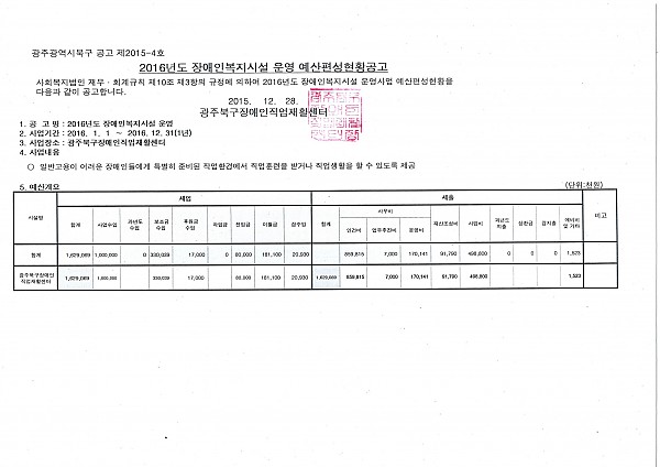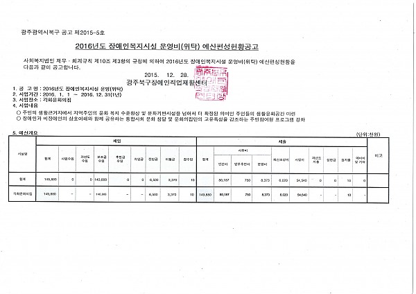 2016년도 장애인복지시설 운영비(위탁) 예산편성현황공고