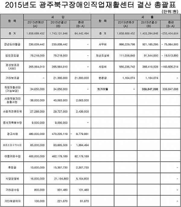 2015년 광주북구장애인직업재활센터 결산 및 후원금 사용내역을 공고 합니다.